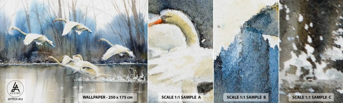 Mostră de Tapet Standard Eco - Dansând cu lebedele sălbatice - Lebedele, Păsări, Peisaj - 100x30 cm