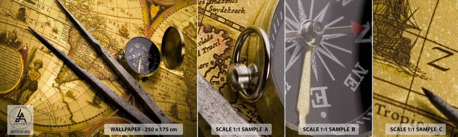 Mostră tapet Premium Sand - Unde sunt aceste comori? - Busolă, Harta lumii, Călătorii - 100x30 cm
