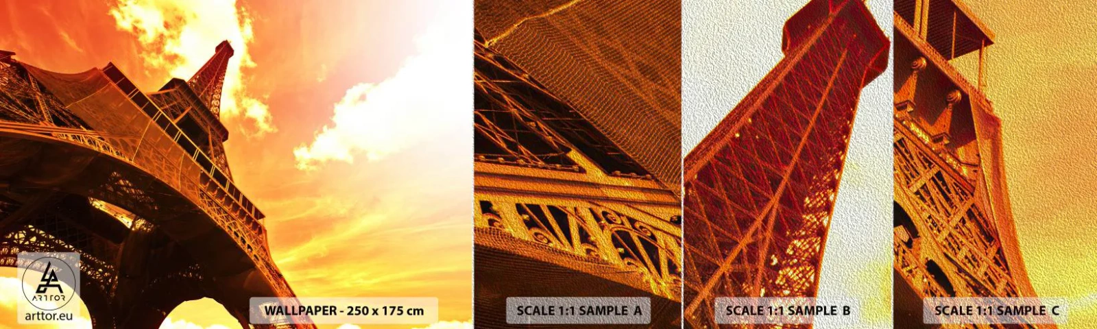 Mostră tapet Premium Sand - Monumental, pentru că aurit de soare - Oraș, Paris, turnul Eiffel - 100x30 cm