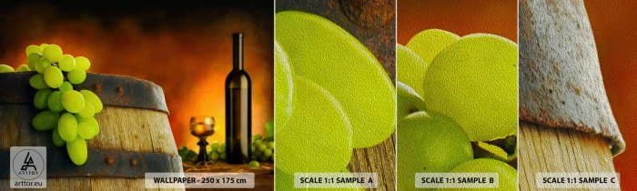Mostră tapet Premium Sand - Natură moartă cu o sticlă de vin și un ciorchine de struguri - Strugurii, Vin, Butoiul de vin - 100x30 cm