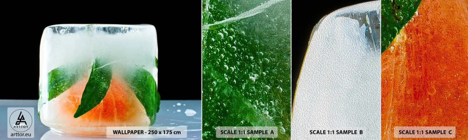 Mostră tapet Premium Sand - Proaspăt și răcoros - Cub de gheata, Portocale, Frunza de menta - 100x30 cm