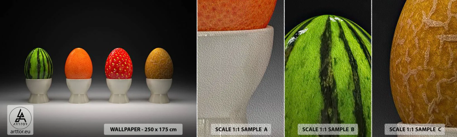 Mostră tapet Premium Sand - Mic dejun cu fructe - Abstracția, Fructe, Ou - 100x30 cm
