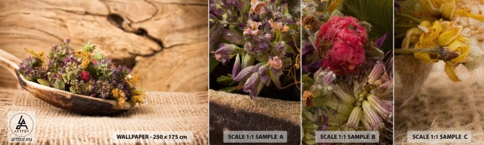 Mostră tapet Premium Sand - Flori colorate și ierburi parfumate - Natură, Ierburi uscate, Bucătărie - 100x30 cm