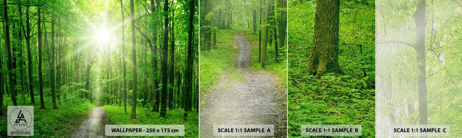 Mostră tapet Premium Sand - Catedrala verde - Peisaj, pădure, Raze de soare - 100x30 cm
