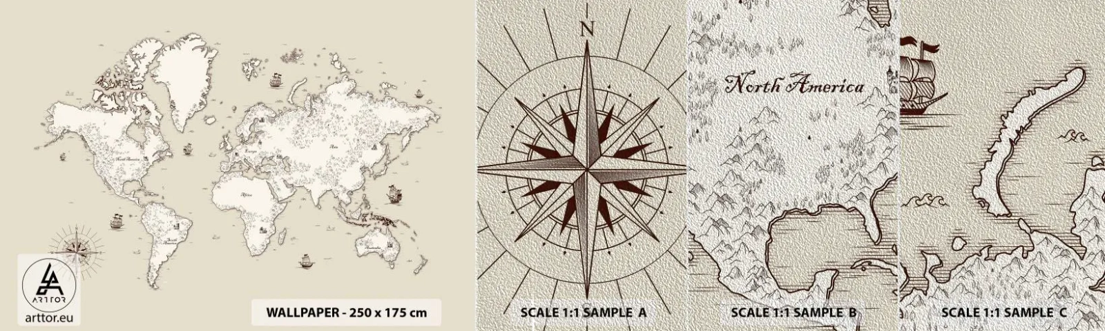 Mostră tapet Premium Sand - O călătorie în jurul lumii - Harta lumii, Continente, Corabie de pirati - 100x30 cm