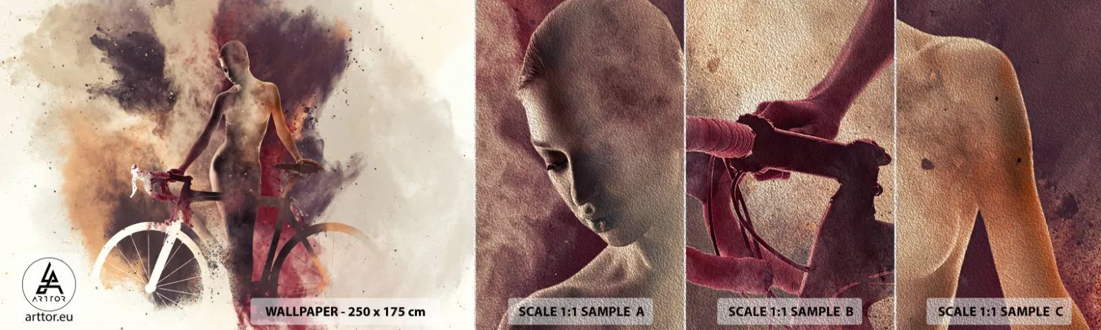 Mostră tapet Premium Sand - În forme de marmură sufletul ciclist - Abstracția, Femeie, Bicicleta - 100x30 cm