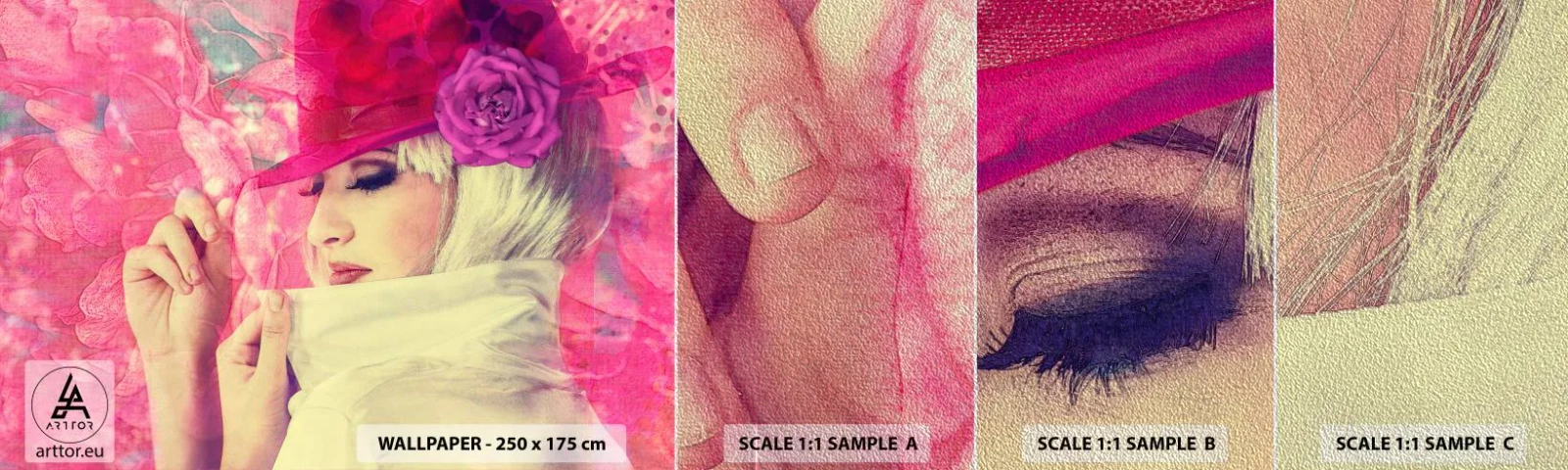 Mostră tapet Premium Sand - Portret retro în roz - Femeie În pălărie, Flori, Modă - 100x30 cm