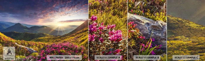 Mostră tapet Premium Sand - Prospețimea unei dimineți de munte - Peisaj, Munţi, Flori - 100x30 cm
