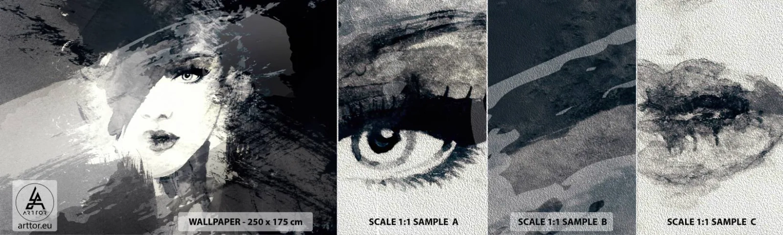 Mostră tapet Premium Sand - Din spatele unui voal gri - Chipul de femeie, alb-negru, Ochi - 100x30 cm