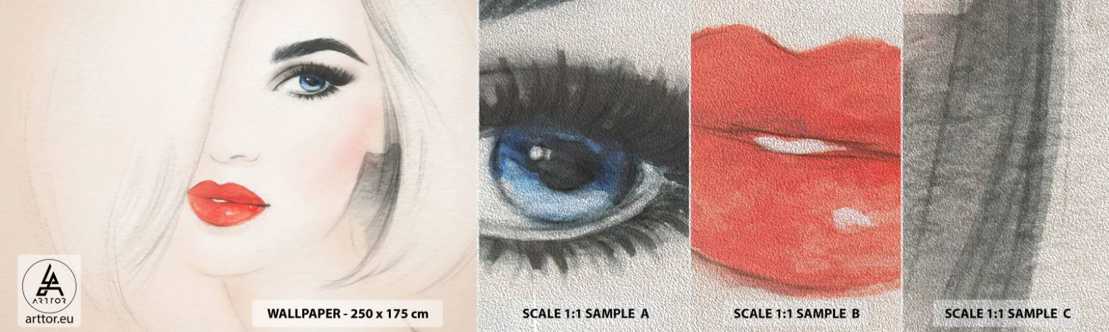 Mostră tapet Premium Sand - Hipnotizează și intoxică - Portretul unei femei, Chipul de femeie, buze rosii - 100x30 cm