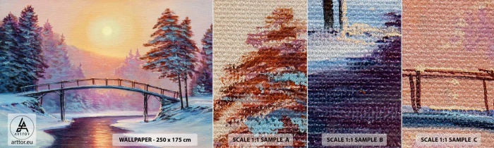 Mostră tapet Premium Sand - Cele patru anotimpuri - iarna - Peisaj, Râu, Pod - 100x30 cm