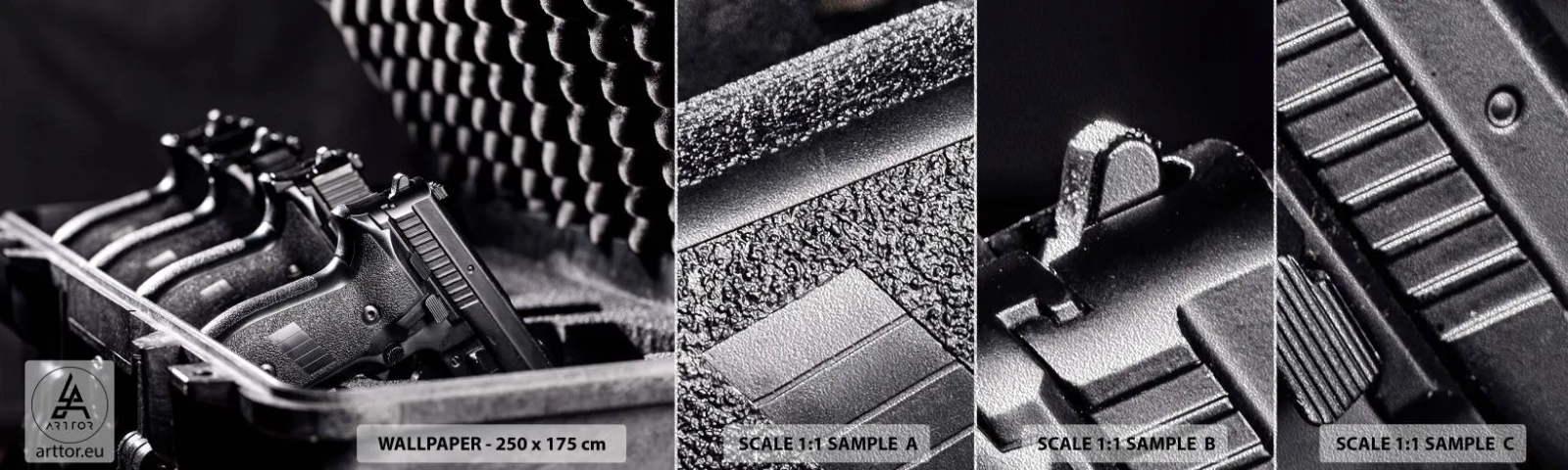 Mostră tapet Premium Sand - Sport masculin - Militar, Armă, Pistolă - 100x30 cm