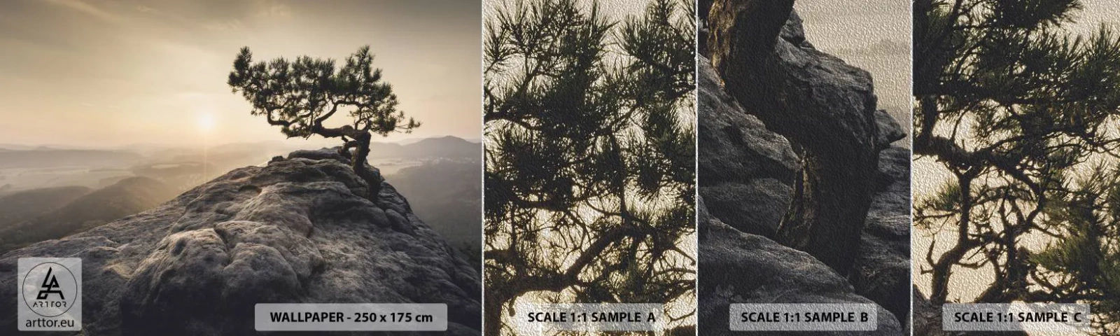 Mostră tapet Premium Sand - Viața învinge întotdeauna - Peisaj montan, Pin, Munţi - 100x30 cm