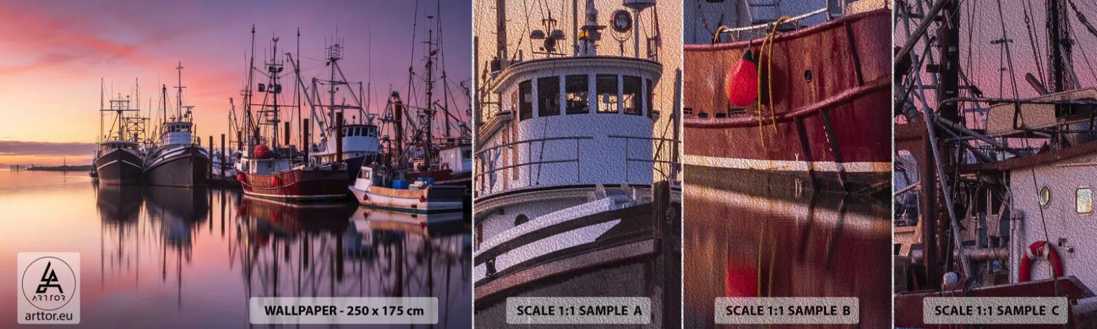 Mostră tapet Premium Sand - Înainte de o zi plină - Portul Pescarilor, Bărci, Pescuit - 100x30 cm