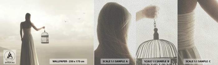 Mostră tapet Premium Sand - Fii liberă - Femeie, Colivie, Pasăre - 100x30 cm