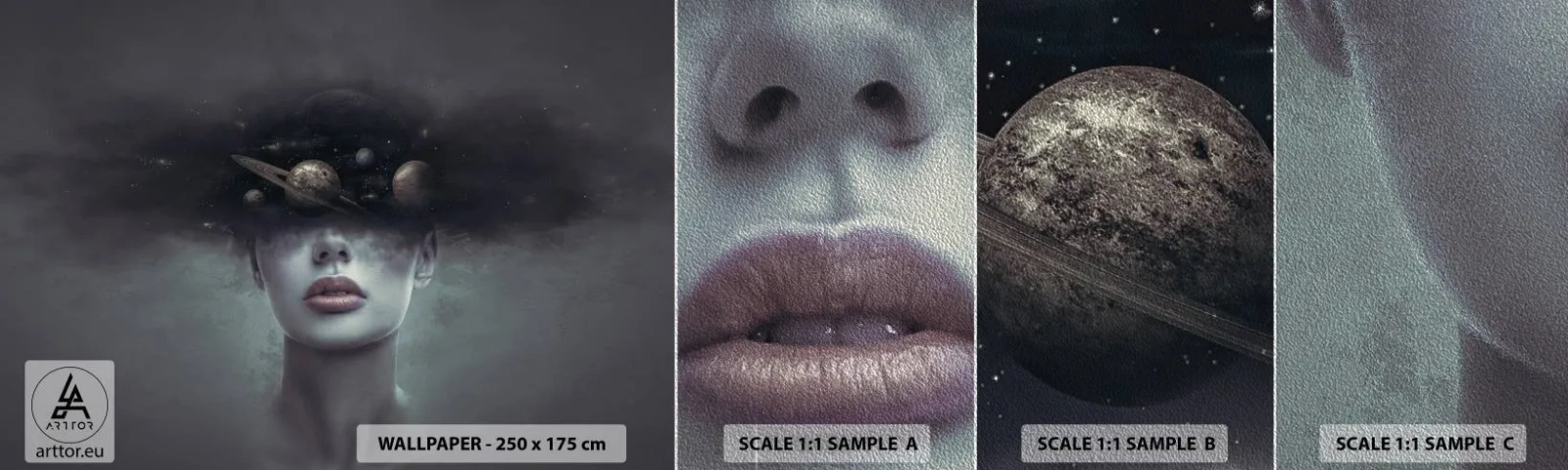 Mostră tapet Premium Sand - Și planetele o iau razna... - Abstracția, Chipul de femeie, Cosmos - 100x30 cm