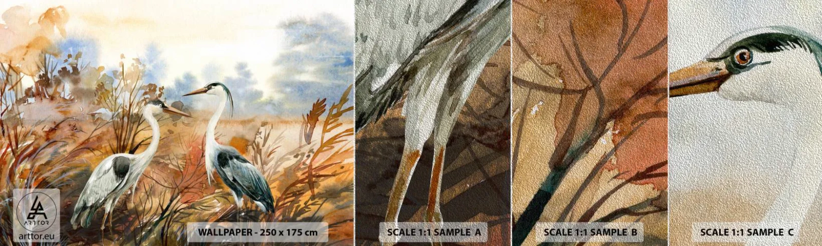 Mostră tapet Premium Sand - Încotro în toamnă? - Macara, Păsări, Natură - 100x30 cm