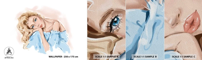 Mostră tapet Premium Sand - Scufundată în vis albastru - Femeie, Modă, Grafică - 100x30 cm