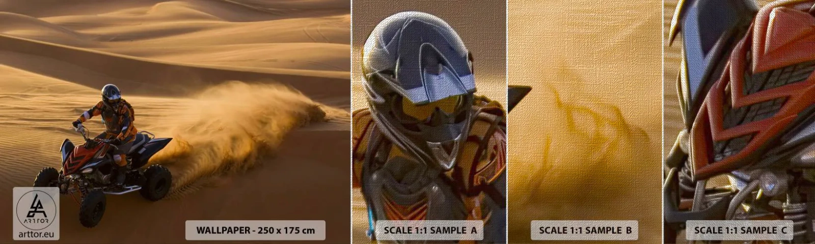 Gramaj mare 290g/m2 împreună cu o structură palpabilă Nisip pe suprafața tapetelor, face produsul o soluție exclusivă și de design pentru oricine caută decorațiuni unice pentru interior. Avantajul grosimii excepționale a materialului este și o acoperire excelentă, care facilitează semnificativ montajul. Structura fototapetă PREMIUM SAND creează impresia unui print pe o structură fină care amintește de nisip.
