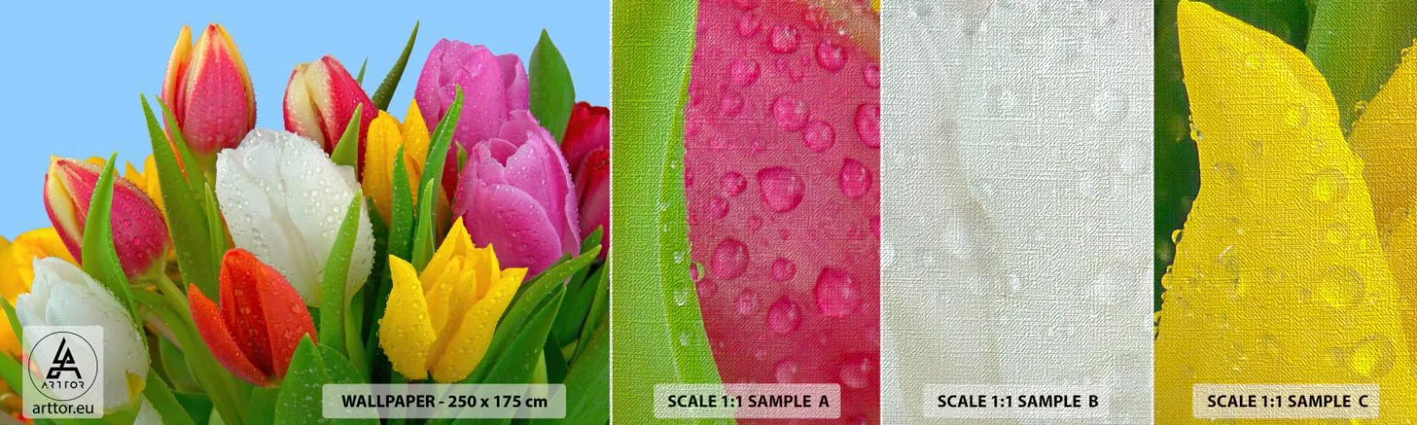 Mostră tapet Premium Canvas - Un curcubeu floral în picături de rouă - Lalele, Flori, Buchet de flori - 100x30 cm