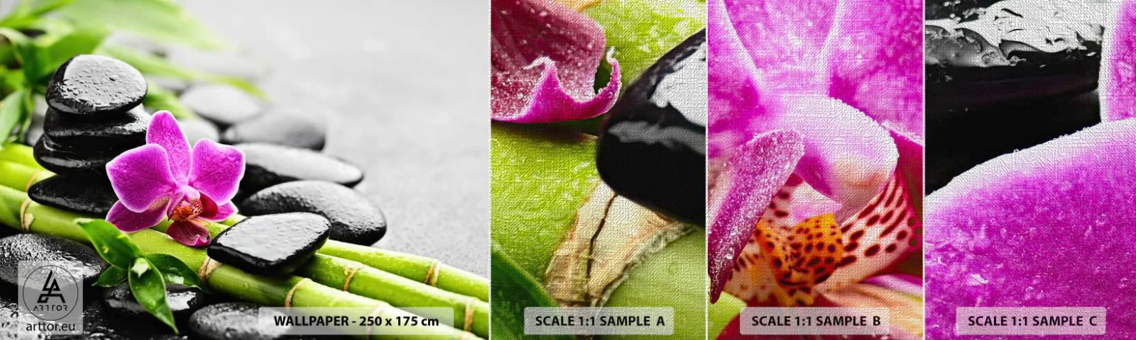 Mostră tapet Premium Canvas - Într-un echilibru pașnic - Flori, Orhidee, Orhidee - 100x30 cm
