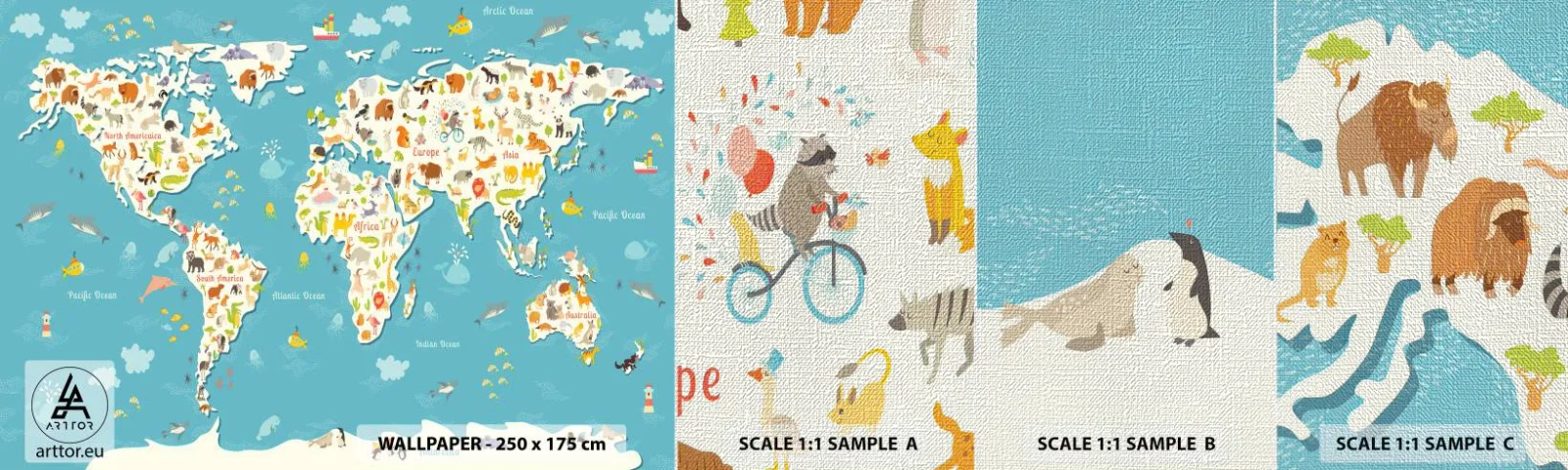 Mostră tapet Premium Canvas - Noi iubim întreaga lume - Harta lumii, Animale, Pentru copii - 100x30 cm