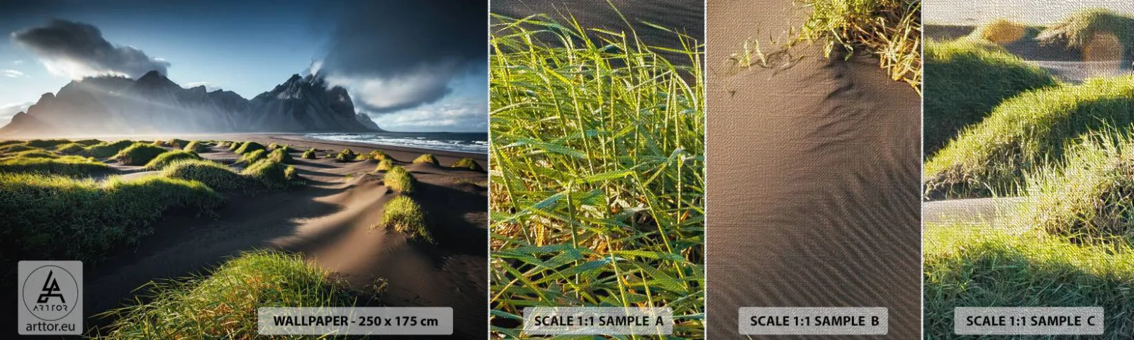 Gramaj mare 290g/m2 împreună cu o structură palpabilă Nisip pe suprafața tapetelor, face produsul o soluție exclusivă și de design pentru oricine caută decorațiuni unice pentru interior. Avantajul grosimii excepționale a materialului este și o acoperire excelentă, care facilitează semnificativ montajul. Structura fototapetă PREMIUM SAND creează impresia unui print pe o structură fină care amintește de nisip.
