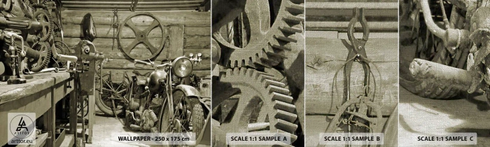 Mostră tapet Premium Canvas - În șopronul unchiului Vlad - Motocicletă, Atelier de reparatii auto, Epocă - 100x30 cm