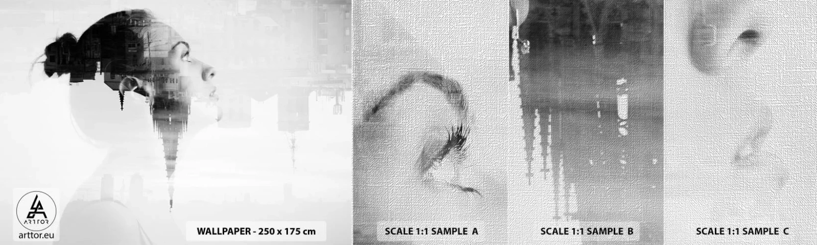 Mostră tapet Premium Canvas - Pe ambele părți ale geamului - Abstracția, Chipul de femeie, Arhitectură - 100x30 cm