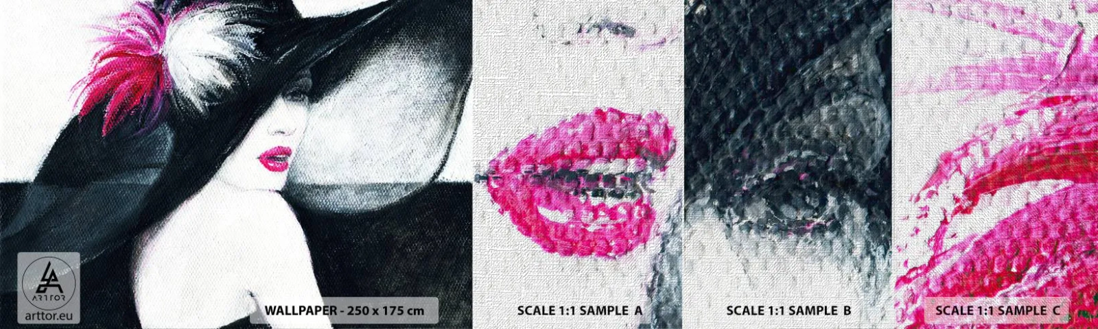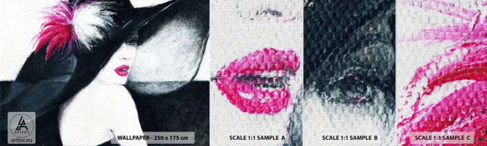Mostră tapet Premium Canvas - Întotdeauna un mister - Femeie În pălărie, Chipul de femeie, buze rosii - 100x30 cm