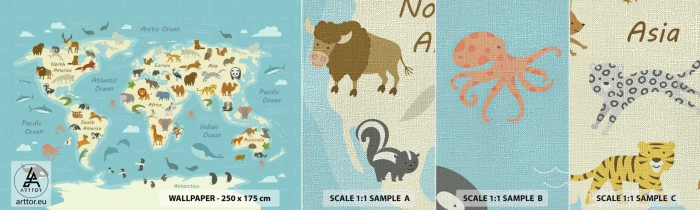 Mostră tapet Premium Canvas - Vecini buni - Harta lumii, Harta cu animale, Animale - 100x30 cm