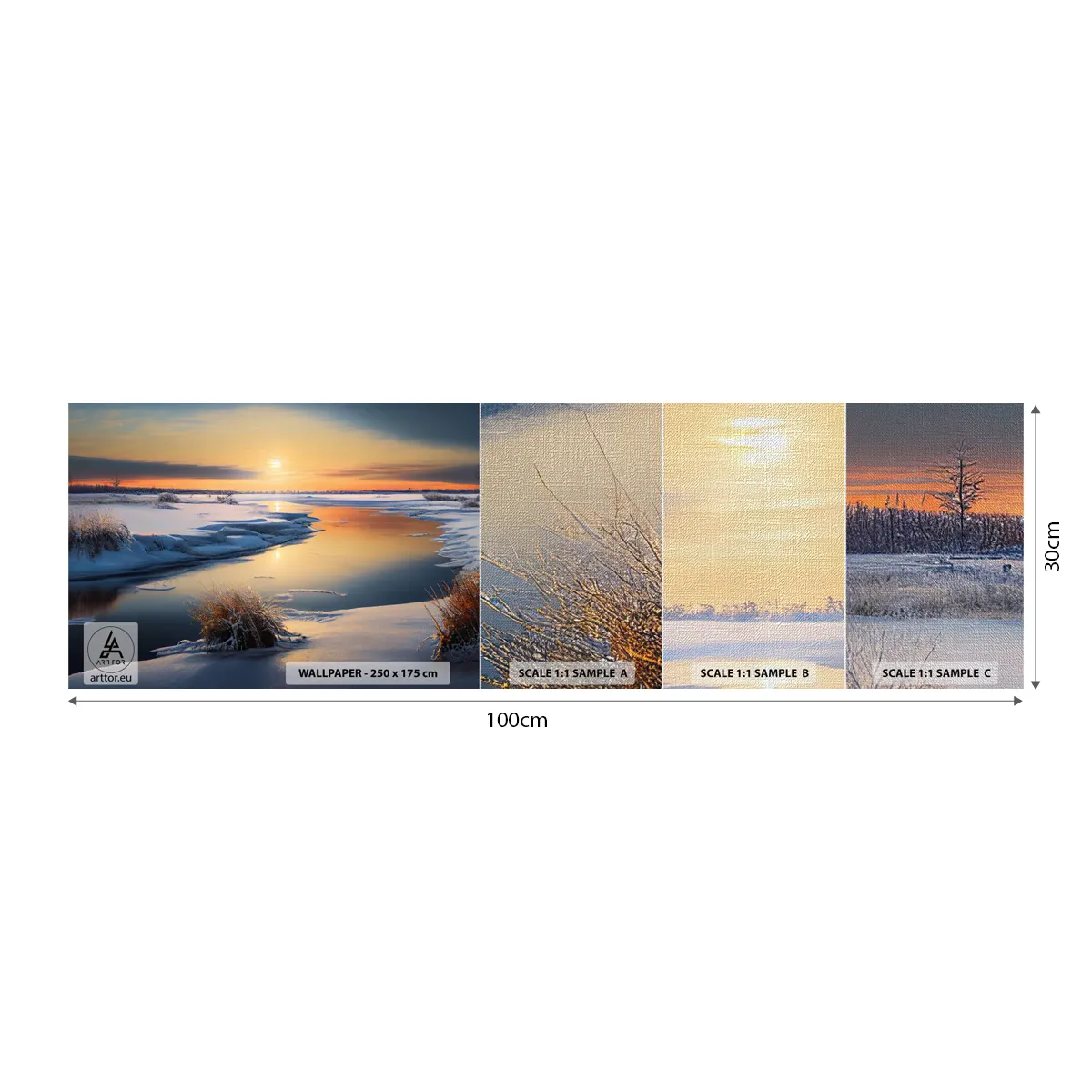 Mostră tapet Premium Canvas - Apus de soare pe timp de iarnă - Iarnă, Râu, Peisaj - 100x30 cm