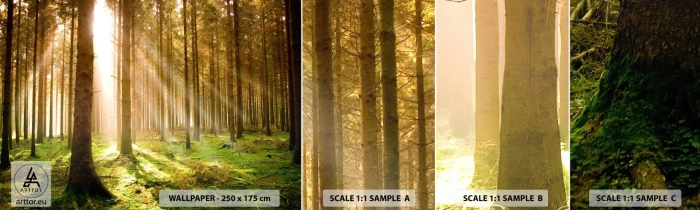 Mostră tapet autocolant Deluxe Sticker - Spiridușii sunt pe cale să apară - pădure, Raze de soare, Natură - 100x30 cm