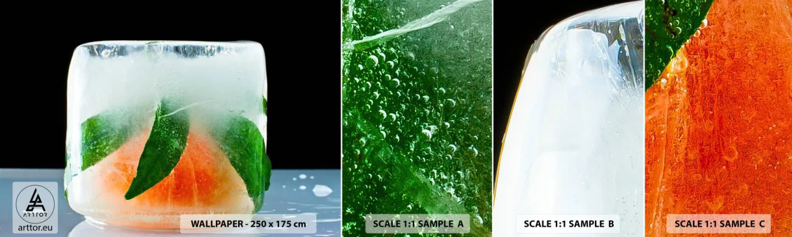 Mostră tapet autocolant Deluxe Sticker - Proaspăt și răcoros - Cub de gheata, Portocale, Frunza de menta - 100x30 cm