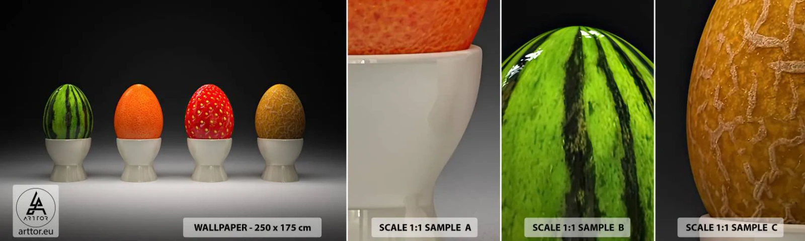 Mostră tapet autocolant Deluxe Sticker - Mic dejun cu fructe - Abstracția, Fructe, Ou - 100x30 cm