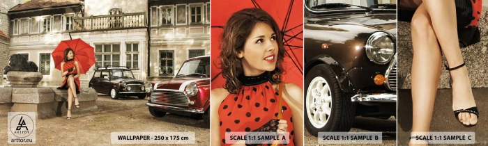 Mostră tapet autocolant Deluxe Sticker - O mini-călătorie sentimentală - Femeie, Arhitectură, Mașină - 100x30 cm