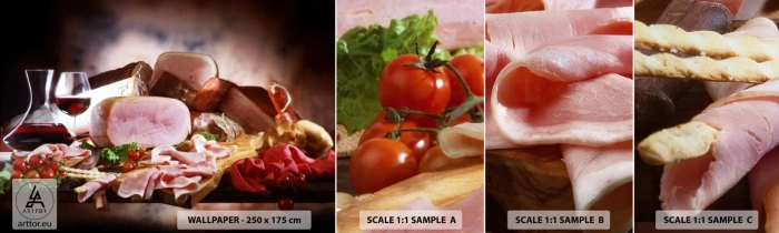 Mostră tapet autocolant Deluxe Sticker - Un vis culinar cu o carafă - Gastronomie, Carne, rosii - 100x30 cm