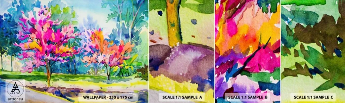 Mostră tapet autocolant Deluxe Sticker - Grădina curcubeului în splendoarea primăverii - Parc, Copaci, Natură - 100x30 cm