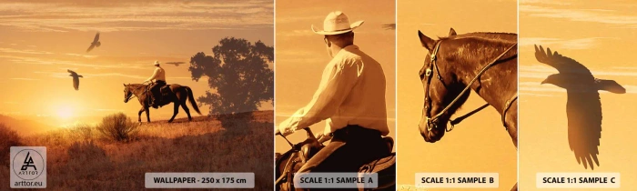 Mostră tapet autocolant Deluxe Sticker - Singur peste prerie - Cal, Cowboy, Peisaj - 100x30 cm