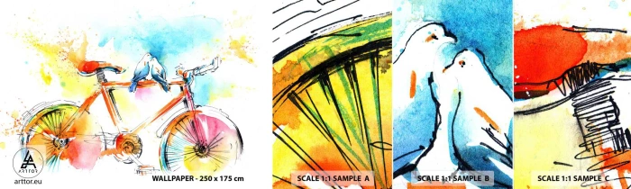 Mostră tapet autocolant Deluxe Sticker - Doi pe o bicicletă - Abstracția, Bicicleta, Păsări - 100x30 cm