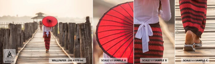 Mostră tapet autocolant Deluxe Sticker - Pe podul vechi - Umbrelă, Birmania, Pod de lemn - 100x30 cm