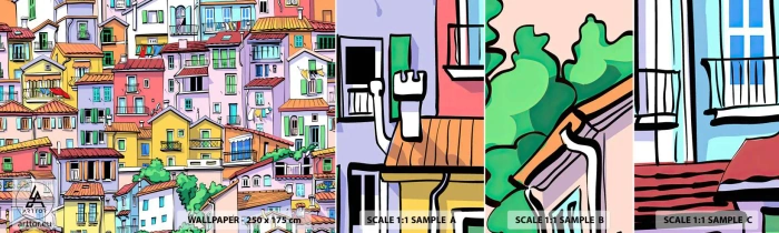Mostră tapet autocolant Deluxe Sticker - Oraș vesel - Oraș, Case de locuit, Case - 100x30 cm