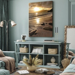 Tablou pe pânză Canvas - Plajă la apus cu pietre pe țărm - 70x50cm - Urmează soarele spre dealuri - Decorațiune modernă pentru perete pentru living și dormitor ARTTOR