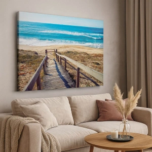 - Acest tablou înfățișează o potecă din lemn care duce la o plajă lângă oceanul azuriu. Perfect pentru iubitorii de natură, aduce o atmosferă liniștită și estivală oricărui interior.