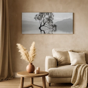 - Această imprimare pe pânză de 70x50 cm înfățișează un copac solitar reflectat în apă pe un fundal de munți în alb și negru. O decorațiune unică ce aduce pace și armonie oricărui interior.