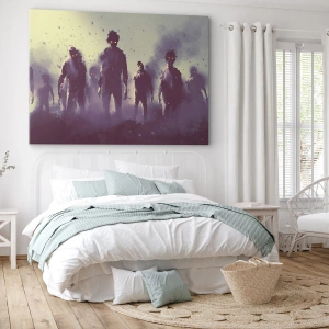 - Această imprimare pe pânză înfățișează siluete misterioase cu ochi galbeni, înconjurate de ceață și o atmosferă întunecată. Este perfectă pentru iubitorii de groază și interioare neconvenționale.