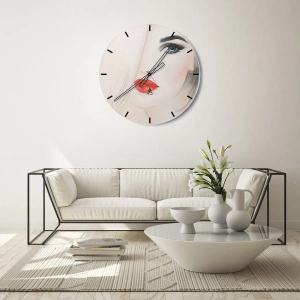 Ceas de perete - Ceas pe sticlă - Portret artistic al unei femei cu buze roșii și ochi albaștri - 30x30cm - Hipnotizează și intoxică - Decorațiune modernă pentru perete pentru living, bucătărie și dormitor ARTTOR
