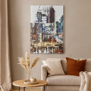 - Acest tablou înfățișează un peisaj urban modern într-un stil artistic cu detalii dinamice. Perfect pentru interioare contemporane.