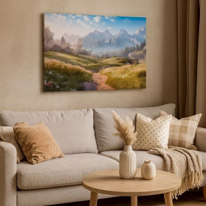 Peisajul inspirat de frumusețea naturii este perfect pentru decorarea interioarelor care prețuiesc contactul cu natura. Detalii precum pajiștile înflorite, cabanele din lemn și culorile pastelate subtile subliniază autenticitatea și profunzimea peisajului.