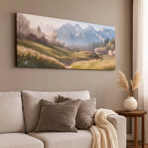 Tablou pe pânză Canvas - O vale de munte cu pajiști, cabane și o priveliște asupra vârfurilor - 70x50cm - Valea idilică - Decorațiune modernă pentru perete pentru living și dormitor ARTTOR